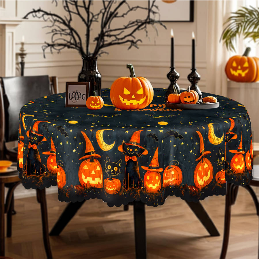 Halloween Tablecloth - Spooky Black Cats, Pumpkins, Bats, Moon & Stars Party DecShape:Rectangle Weave Type:Machine Made Holidays:Halloween Material:Polyester Cover Material:100% Polyester Weaving Method:Woven