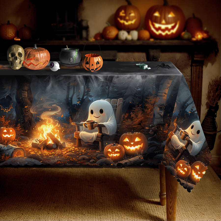 Halloween Tablecloth, Cartoon Ghosts and Bonfire Tablecloth, Vintage Style, UniqShape:Rectangle Weave Type:Machine Made Holidays:Halloween Material:Polyester Cover Material:100% Polyester Weaving Method:Woven