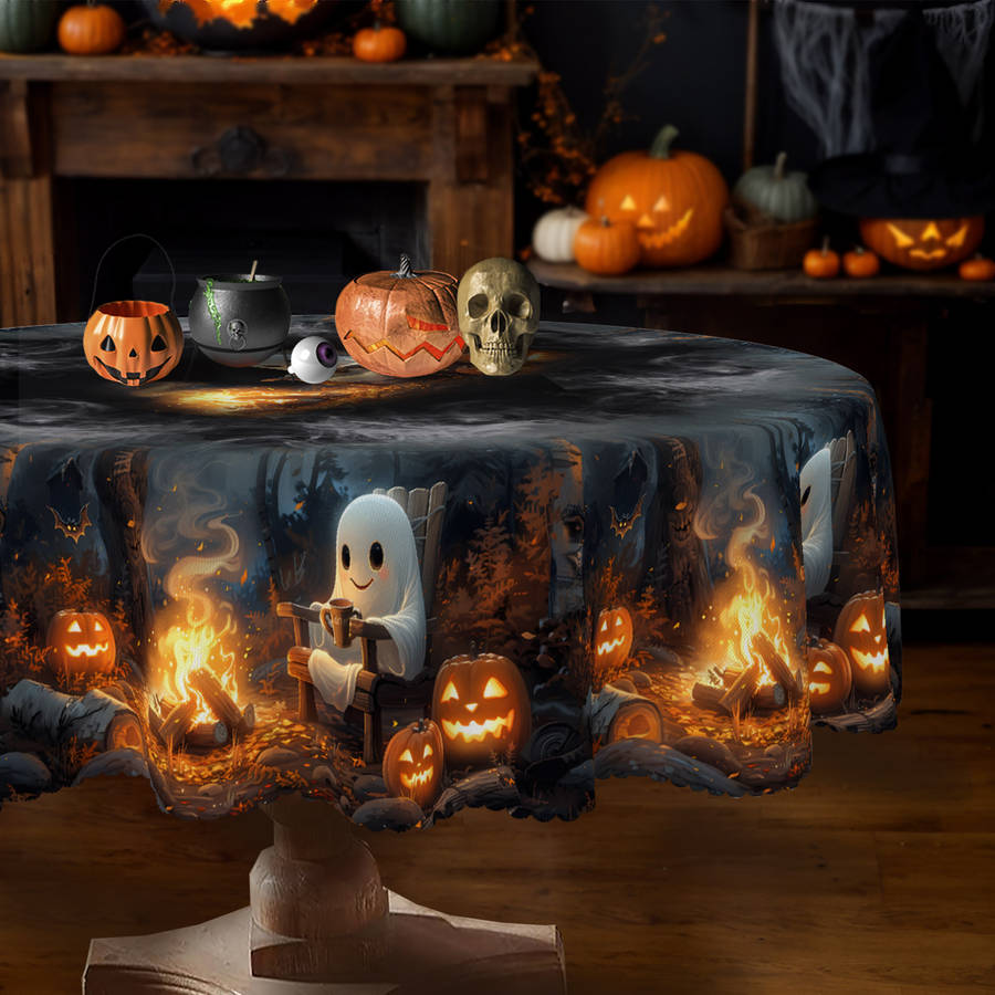 Halloween Tablecloth, Cartoon Ghosts and Bonfire Tablecloth, Vintage Style, UniqShape:Rectangle Weave Type:Machine Made Holidays:Halloween Material:Polyester Cover Material:100% Polyester Weaving Method:Woven