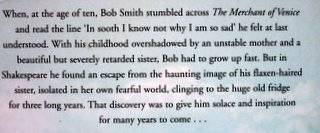 Hamlet's Dresser: A Memoir by Bob Smith is an autobiography of the author's difficult life growing up with a severly retarded sister and unstable mother. He finds solace in reading the works of William Shakespeare.