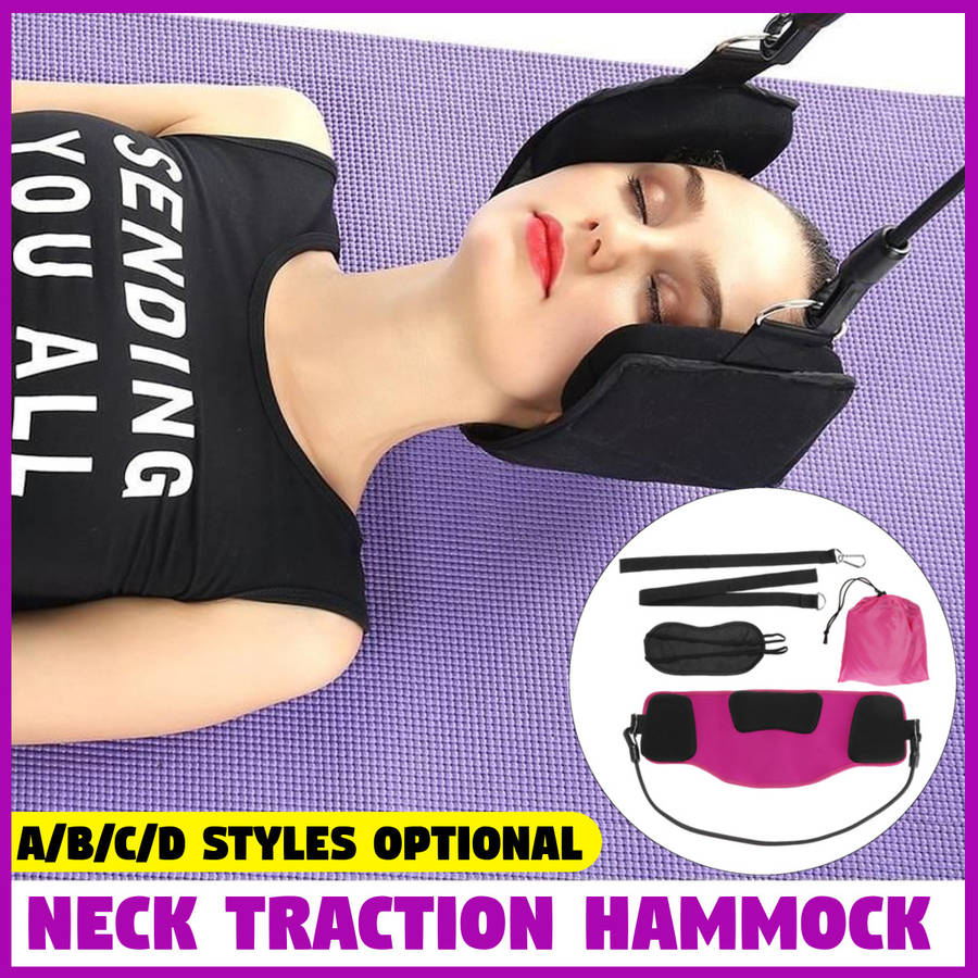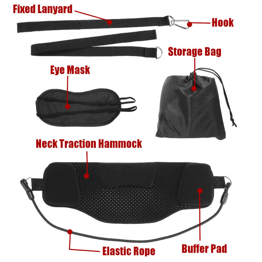 B (Black Breathable Velvet Fabric): 1X Neck Traction Hammock 1X Eye Mask 2X Elastic Rope 2X Hook 4X Fixed Lanyard 1X Storage Bag C (Black Breathable Velvet Fabric): 1X Neck Traction Hammock 1X Elastic Rope 1X Hook 1X Eye Mask 2X Fixed Lanyard 1X Storage Bag D (Black Neoprene): 1X Neck Traction Hammock 1X Elastic Rope 1X Hook 1X Eye Mask 2X Fixed Lanyard 1X Storage Bag Features: - It minimizes tension headaches, enhances sleep quality, and improves posture and alignment. - A portable and compact cervical traction unit that effectively relieves neck pain from home,in the office,or while traveling. Benefits: Eliminate Pain Relieve Energy Improve Sleep Quality Promote Proper Alignment Improve Posture Blood Flow Circulation Solve Most Neck And Head Problems: Neck Pain Tension Headache Trouble Sleeping Stiff Neck Poor Posture How To Use It: 1.It requires only a door or rail to function properly. 2.Simply wrap the fabric hook around the back handle, that which is hidden from view, of a closed door, so that the leash passes between the door and the doorjamb. 3.If using a rail or pole, wrap the fabric around something parallel to the floor. 4.Then lay on the ground, keeping the body straight and the back against the floor with the head and neck cradled by the hammock. 5.Benefits can be felt with just 10 minutes of use per day.