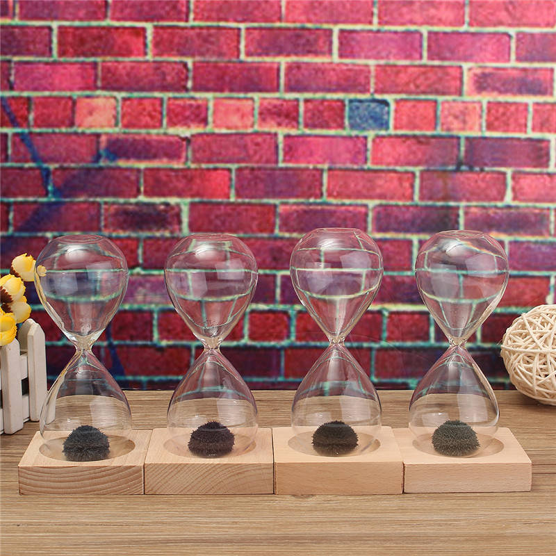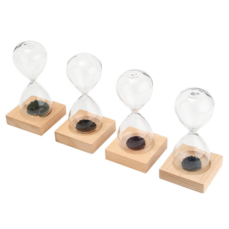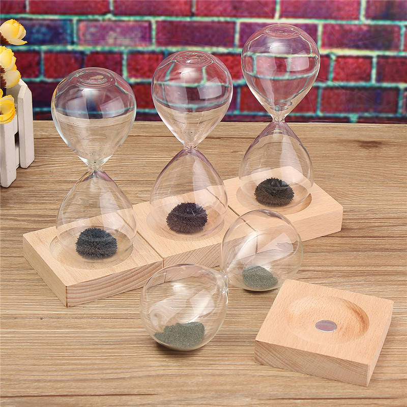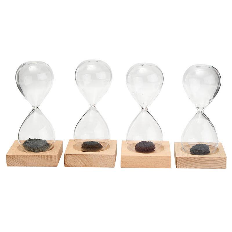 Specifications: Materials: Glass,Solid wood, magnetic, and iron filings Dimensions (hourglass): 165mm Height *60mm Diameter; Dimensions (base): 80*80*20mm Sand Color: Black;Purple;Blue;Green