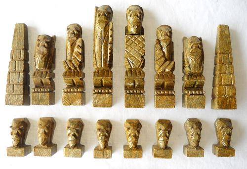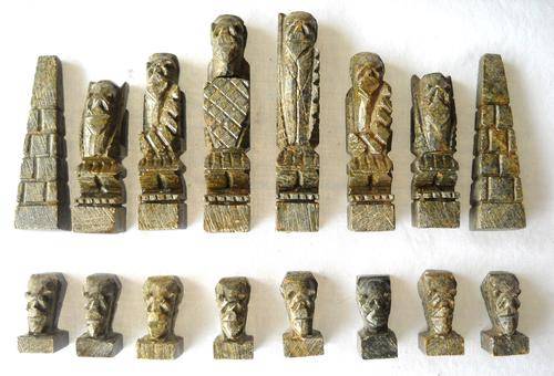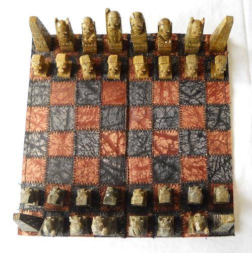 I am pleased to offer this Vintage Hand Carved Stone Chess Set. It comes complete with a Leather Chess Board, sewn in squares of Blue and Pink leather on the playing side and finished off in Brown Suede on the other. It folds in half.
