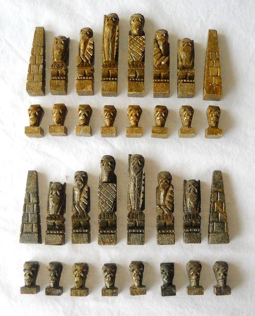 The Kings stand 7 cm tall and the Pawns, at the other end of the scale, stand 2.2 cm tall. All the pieces are 1.1 cm wide.