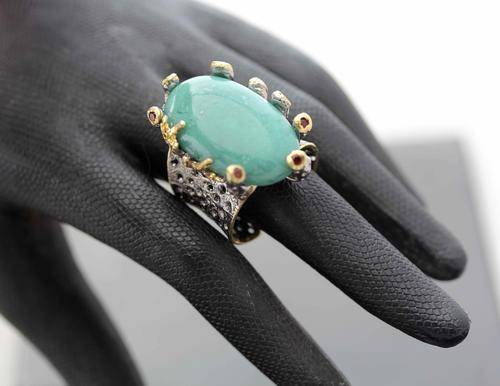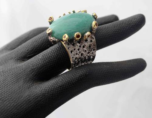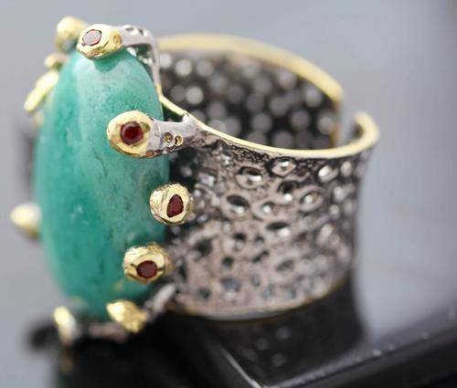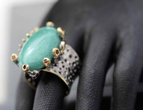 I was rather fascinated with this jeweller's hand-crafted pieces of jewellery. He refers to them as "jewellery art" and each piece is one of a kind. This ring features a very large natural turquoise gemstone that is sea-green in colour. It is a beautiful smooth cabochon, 13.06 carats in weight. Its quality is beautiful and its colour unusual. This particular stone comes from Africa. The ring itself is solid sterling silver that has been hand-beaten into a very broad shank (16 mm at the head and 10 mm at the back) with die-cut holes through the silver and a rough texture on top. The back of the shank is open but its a solid piece so it won't stretch much beyond its actual size of 6/half. Maybe 6/three quarters. The turquoise is "claw-set" in a rather unusual rough set of extended silver claws that have been topped with a copper colour finish into which African garnets have been bevel set. Its quite a fascinating piece of jewellery. Looks great on the hand and will appeal to someone who likes very different, natural jewellery.