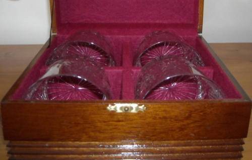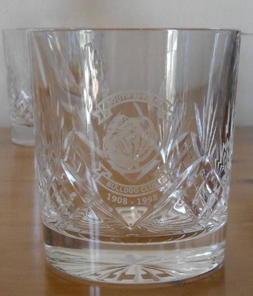 Absolutely stunning hand cut Somerset Crystal balbous decanter with 4 whisky glasses in their original box. The decanter and glasses have been engraved with a bulldog and "South African Bulldog Club" (see photo's). Decanter with stopper measures 23cm in height and has a middle circumference of 38cm. Glasses measure 9cm in height, rim diameter of 8.3cm. A truely beautiful set in mint condition. Postage will be R60 as the decanter alone weighs 1.4kg.