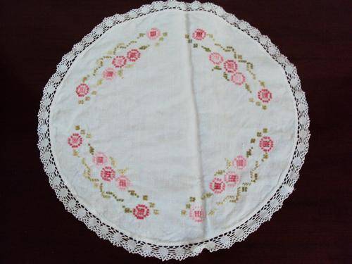 Hand embroidered SUMMER FLOWERS on white linen edged in lace 44cm diam