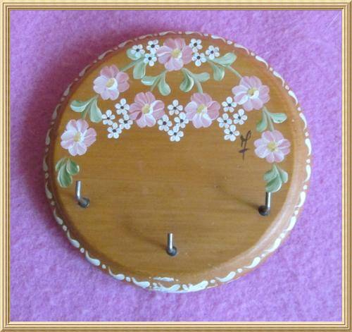 A lovely Hand Painted & Signed Round Floral Wooden Key Holder, diameter of 12cm.