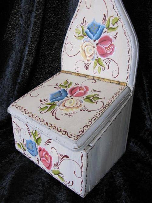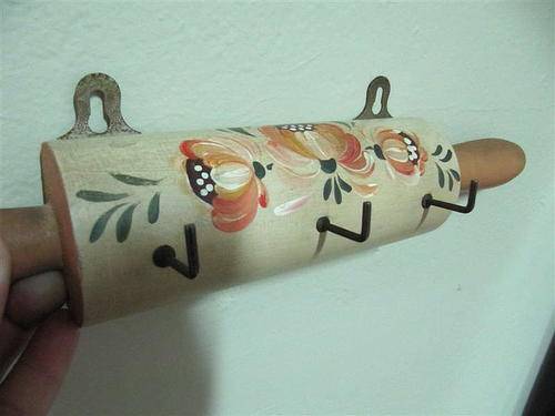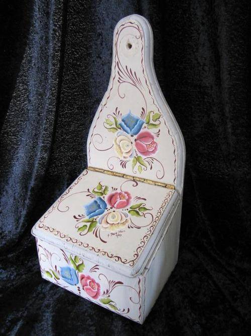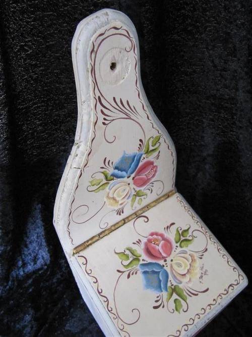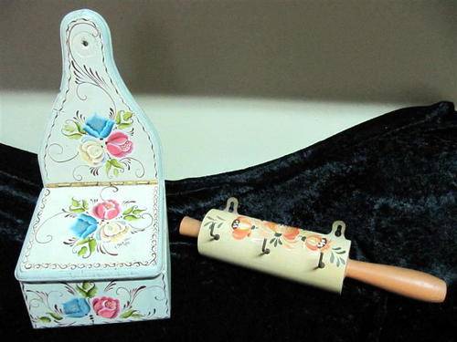 Your bid is for the pair. A stunning finely painted wooden salt box, with a floral theme. The talented artist has also placed her signature on the lid! Also included is a hand-painted key holder / kitchen towel holder in the form of a rolling pin. Perfect for behind the kitchen door!