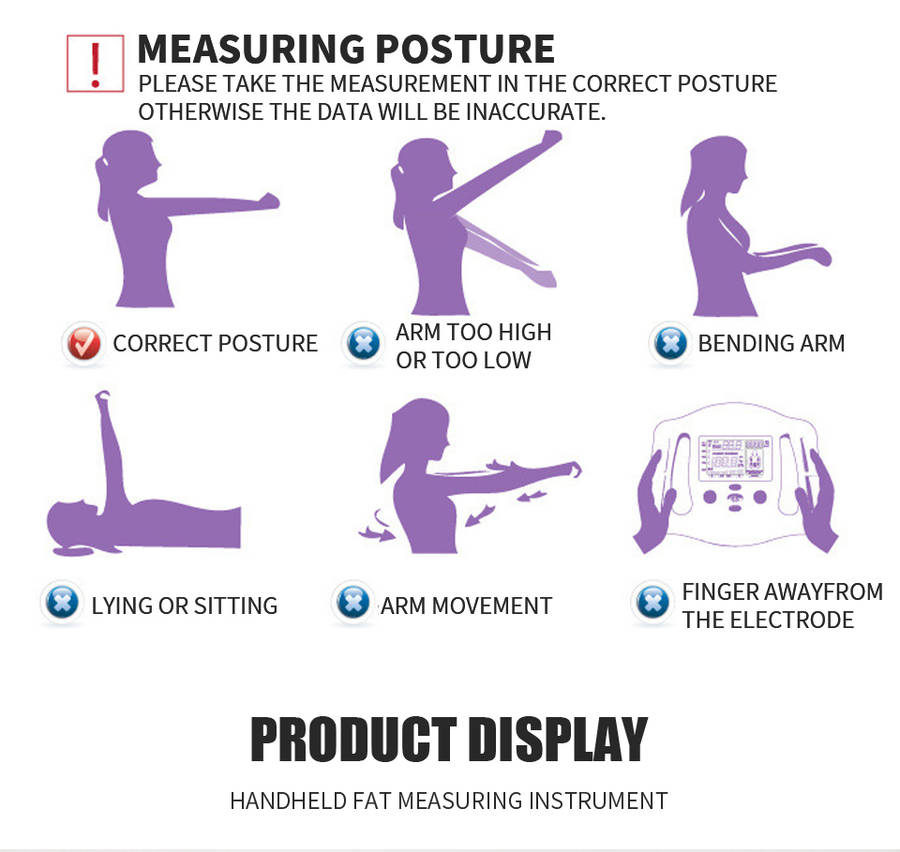 Introduction : 1. Body fat percentage is calculated by the five data in the formula that are height, weight, age, gender and the resistance value between 2 palms. This formula is developed among different people groups and has been tested. It is categorized into : low, standard, slightly high and high. 2. BMI is calculated by : weight (KG) / square of height (M). It is categorized into : emaciated, standard, slightly obese and severely obese. 3. Basic metabolism rate is calculated according to the input personal data. It shows the regular daily heat consumption except the heat consumed during sporting. 4. You can timely find out the body fat percentage and try to balance your daily diet and sports according to the measurement result, so as to achieve the goals of being healthy, fit and pretty.