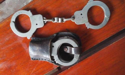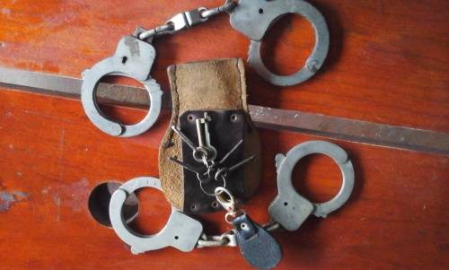Vintage South African Police Force handcuffs with keys ..including additional keys and original leather holder . These cuffs were used in 1970,s to 1980,s .SAP markings .R50.00 postage via Post Office within SA .