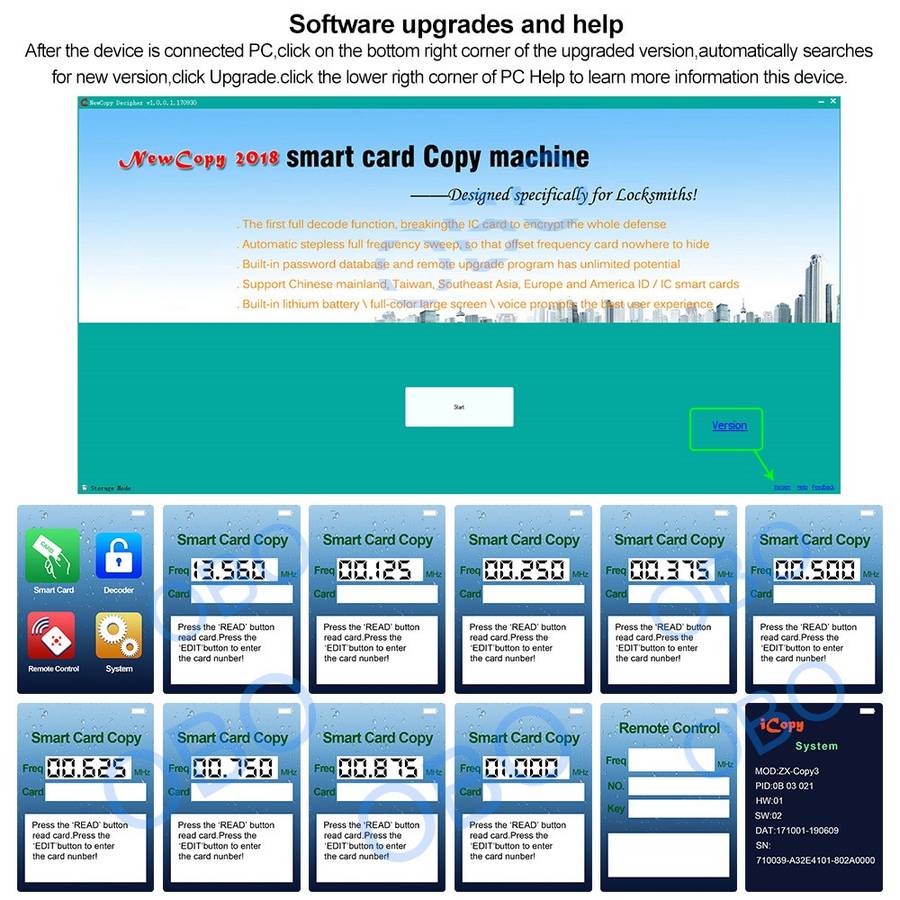 8. Support card type: Support IC, MF1,ID, TK4100, EM4100, HID26, HID35, HID37, GID64, GID50, GID40, GID32, GID16, SID64, SID50, SID40, SID32,125KHZ,13.56MHZ; It supports hundreds of smart cards including Asia, Europe, America, Southeast Asia, Affrica, Australia etc.