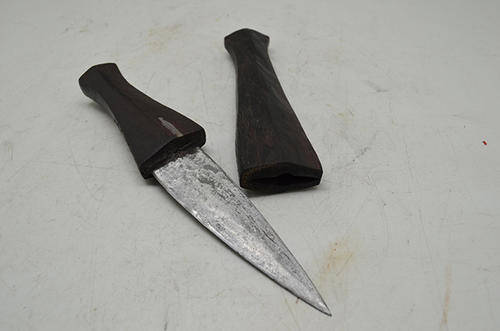 Carved wooden sheath. Blade looks like it may have been shortened from a bayonet