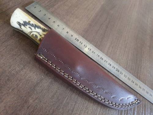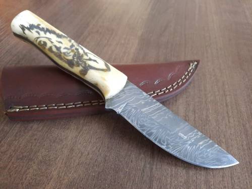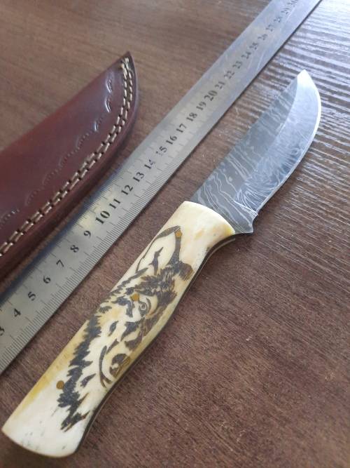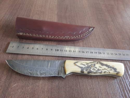 Handmade Damascus steel HUNTING knife with Camel Bone handle scales. Crazy R1 start, No reserve auction.