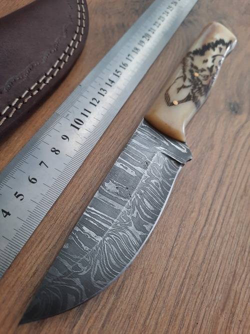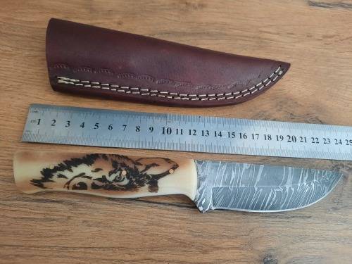 Handmade Damascus steel HUNTING knife with CAMEL BONE handle scales.