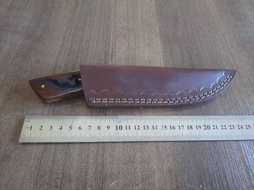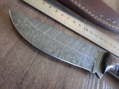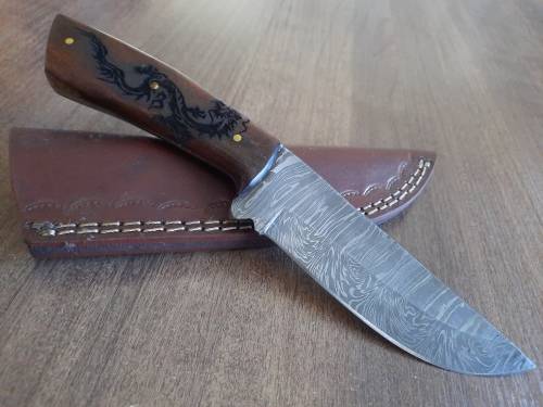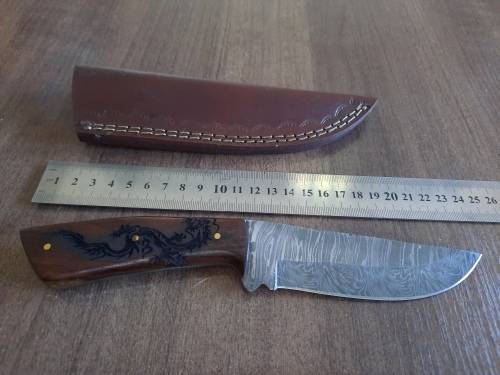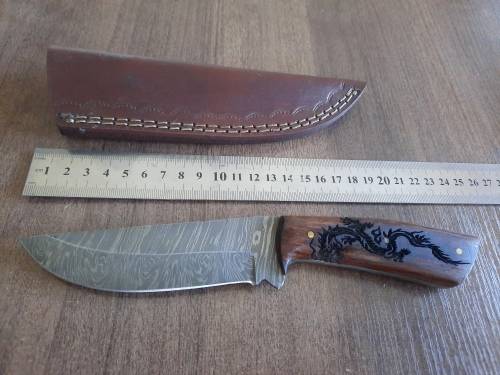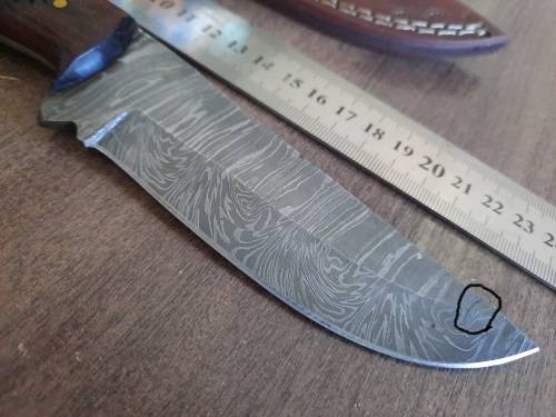 Handmade Damascus steel HUNTING knife with Wooden handle scales. Folding/Forging fault caused a (hairline crack) as indicated and clearly marked on this auction. Please look at all pictures before placing your bid.