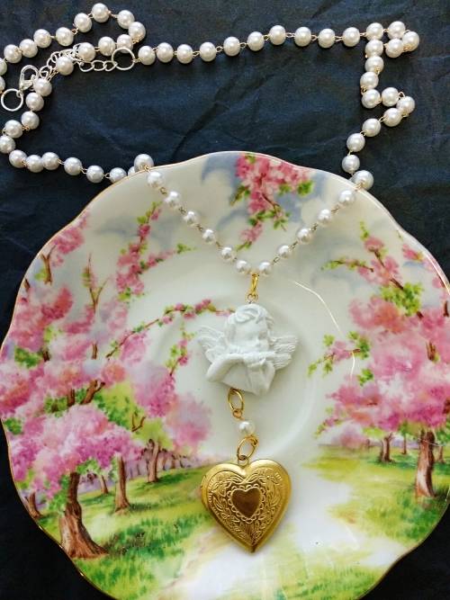 The length from the angel to the locket is about 9.2 cm. The length of the entire pearl chain is about 65 cm and the diameter of each imitation pearl is 0.6 cm. Chain length is adjustable as there's a 7 cm extension chain connected to the main chain.