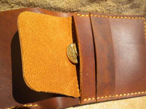 Coin pocket on outside of wallet with simply a fold in closure, no metal clips.