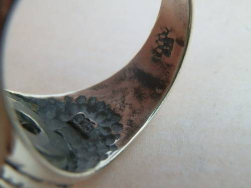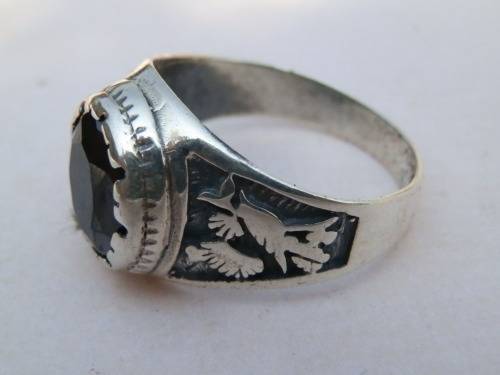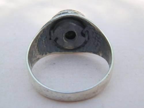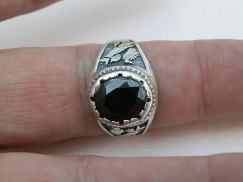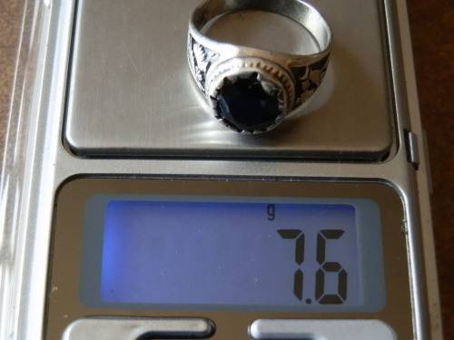 Very nice comfortable sterling silver ring, set with a dark stone, marked 925 and in good condition. The size is U / 10.5, top width approx 14 mm and the weight 7.6 g. The size of the stone is approx 10 x 11 mm. Good value for money.