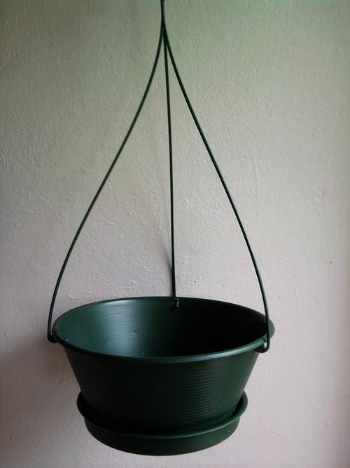 THIS BEAUTIFUL HANGING BOWL IS THE IDEAL WAY TO ENHANCE YOUR VERANDA OR ADD INTEREST TO OTHER AREAS OF YOUR GARDEN. IT IS JUST WAITING TO BE FILLED WITH COLOUR FROM YOUR LOBELIAS, PETUNIAS OR OTHER FAVOURITES. IT IS 200MM ACROSS, COMES COMPLETE WITH BASE AS SHOWN, HANGING STRAPS AND HOOK. THIS QUALITY SOUTH AFRICAN PRODUCT IS GREEN IN COLOUR. .