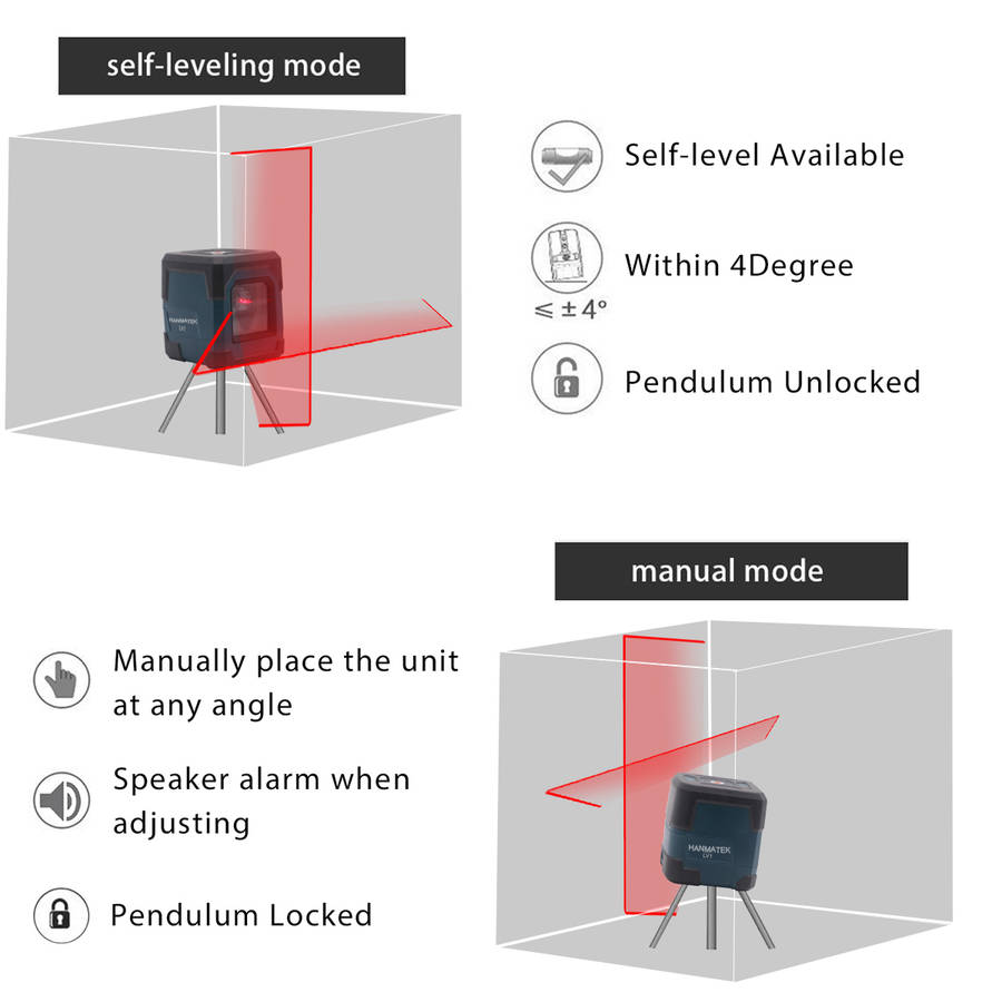 ★ Self-leveling mode & manual mode-You can set 2 modes Cross-line laser with slide switch. Self-leveling mode, functioning in leveling and compensation range: can be self-leveling if tilted below 4 ° ± 1 °, 4 °. If you tilt more than 4 degrees, the laser level will issue a warning. In manual mode, the self-leveling feature is disabled and the cloth is locked to use the device at any angle.
