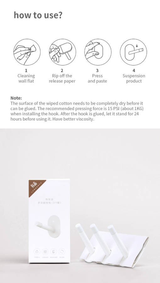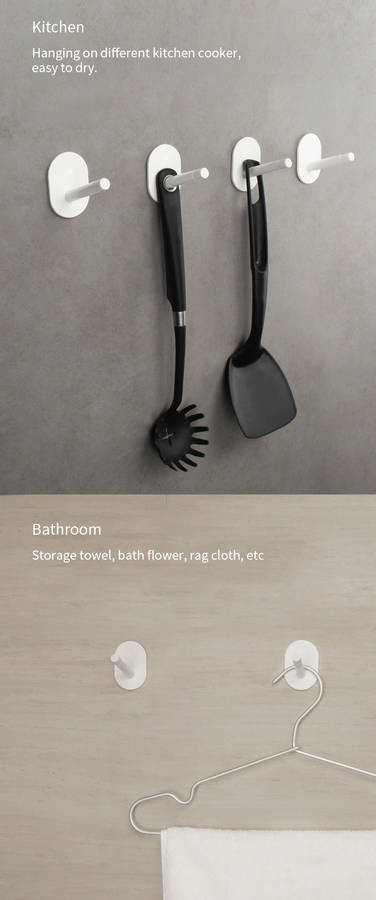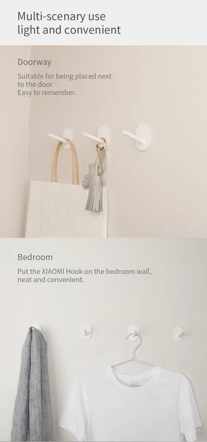 Multi-scenary use, light and convenient. --[Doorway] Suitable for being placed next to the door Easy to remember --[Bedroom] Put the XIAOMI Hook on the bedroom wall, neat and convenient --[Kitchen] Hanging on different kitchen cooker, easy to dry --[Bathroom] Storage towel, bath flower, rag cloth, etc Durable, not easy to deform Not afraid of direct sunlight ABS resin material, also fit to use at temperatures around 40 ᆪC