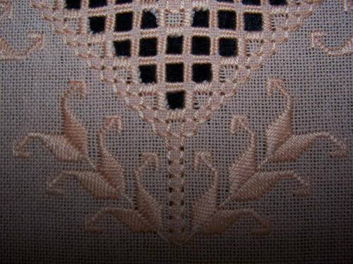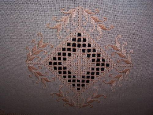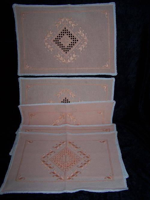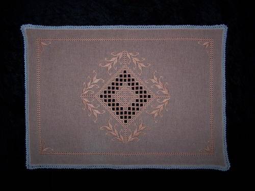 Beautifully executed Hardanger Embroidery. The place mat/tray cloth is light apricot in colour with a white hand crocheted border.
