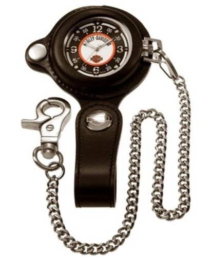 Harley-Davidson® Bulova Pocket watch with black leather belt fob and chain. Luminous dial; hands; and markers. 76A135