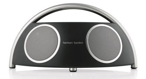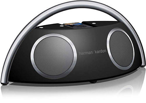 The portable system features a horizontal iPod cradle, stainless steel handle and speaker grilles, and can be battery or AC powered. The Go+Play also offers , touch-sensitive controls, and S-video out.