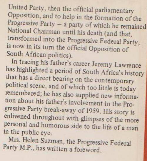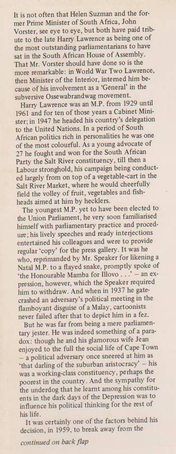 Harry Lawrence By Jeremy Lawrence - South African MP, published in 1978, 276 pages, hardcover with dustjacket, scuffing etc & age spots on some pages however all pages are intact and are quite readable.