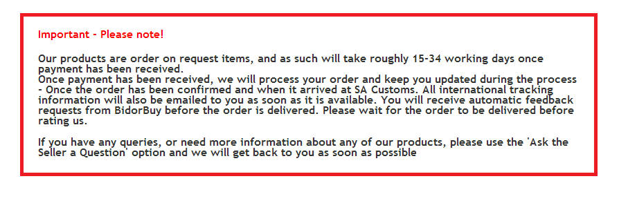 R35.00 Standard shipping using one of our trusted couriers applies to most areas in South Africa. Some areas may attract a R30.00 surcharge. This will be calculated at checkout if applicable.