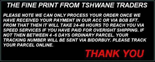 R35.00 Standard shipping using one of our trusted couriers applies to most areas in South Africa. Some areas may attract a R30.00 surcharge. This will be calculated at checkout if applicable.