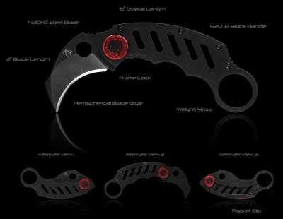 The hawk-bill style blade looks extremely intimidating and is lethal and extremely accurate. The 420HC provides lasting sharpness, but also allows you to sharpen it with ease. The spacer and pivot are both bright dipped type-3 hard anodized which of course...is military spec. The red ellipse finds its home at the center of this piece, letting the enemy, or whoever happens to be observing know; you own one of the best designs that money can buy.