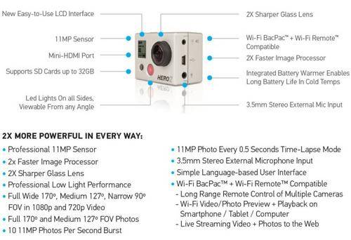 GoPro cameras are used by more professional athletes, sports filmmakers and core enthusiasts than any other camera in the world. The HD HERO2: Outdoor Edition is the most advanced GoPro camera yet. Wearable and gear mountable, waterproof to 197′ (60m), capable of capturing professional full 170º wide angle 1080p video and 11 megapixel photos at a rate of 10 photos per second, the HD HERO2 is the world’s most versatile camera. Whether your goal is to capture a great day out with friends or you’re gunning for the cover of a magazine, the HD HERO2: Outdoor Edition can help you nail it and look like a HERO.