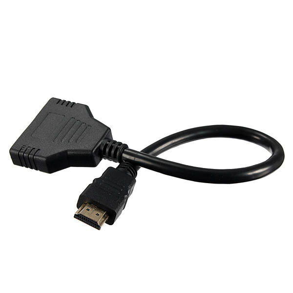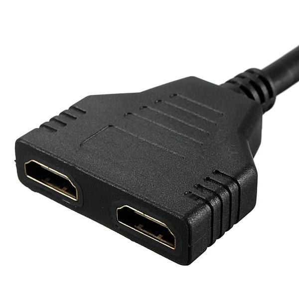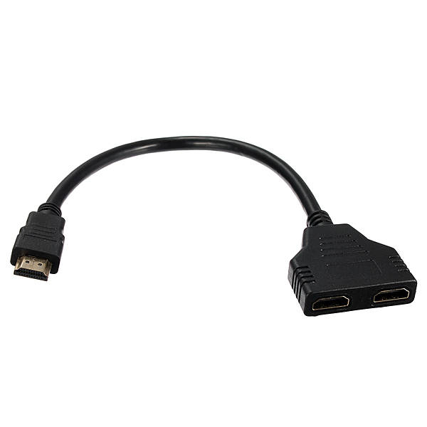 HDMI Male to 2 HDMI Female 1 in 2 out Splitter Adapter Connector Cable This HDMI splitter cable is ideal for connecting one HDMI compatible device (Xbox, Blueray, DVD players, PS3) to two visual output devises. It takes a signal from one device such as a Bluray player and will direct to one of two output devices that are plugged into it. This product can act as a signal router, for example, you may have a TV in two separate rooms, you can have a TV on in one room and when you want to switch room and keep watching the TV, you just need to switch one TV off and switch the other TV on, and then the signal is routed to the TV in the other room. Features : 1. Brand new and high quality. 2. 1 HDMI male to 2 HDMI female splitter cable. 3. Support 480i, 480p, 720p, 1080i, 1080p. 4. Gold_plated connectors for better signal transfer. 5. Allow to connect HDMI devices that have Build-in HDMI ports, like HDTV, PlayStation 3, Upconvertor DVD Player, satellite boxes, LCD Monitor and projectors. 6. Length : About 11.8 inch (30 cm). 7. Color : Black. Note : Only 1 output device should be active at any time unless both of the 2 display devices share the same size and model.