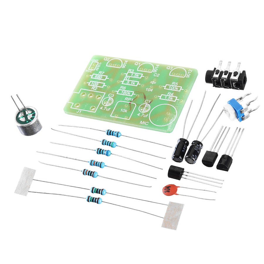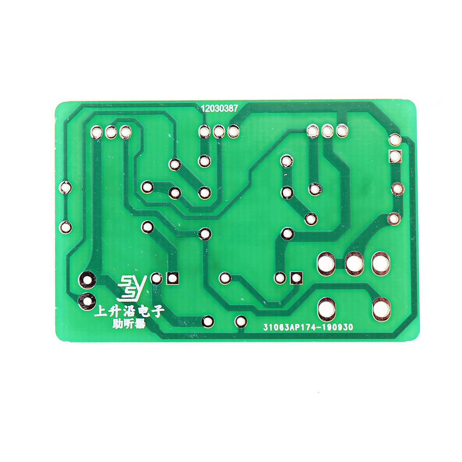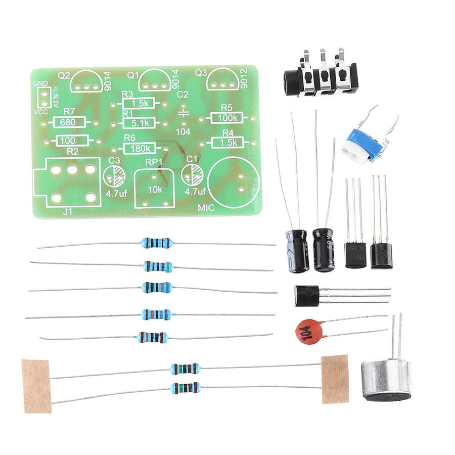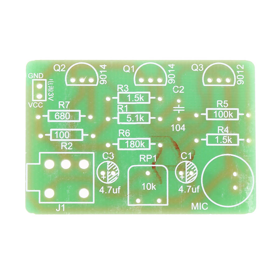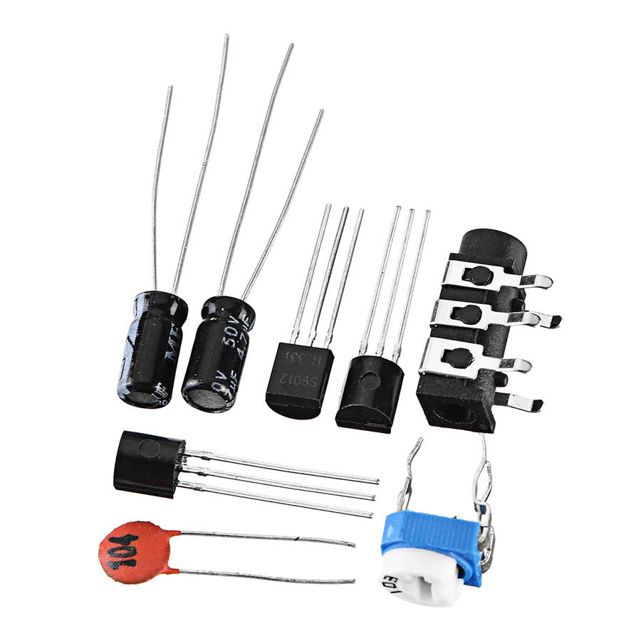Voltage: 3V Audio output: 3.5M audio jack headset PCB outline size: 45 * 30mm The hearing aid kit consists of a microphone, a front low-amplifier, a power amplifier circuit, and a headphone jack. It has the characteristics of high sound receiving sensitivity, is practical for people with hearing impairment, and is simple to produce and low in cost. This kit is also an ideal training kit for learning analog circuits.