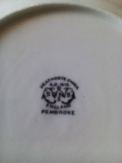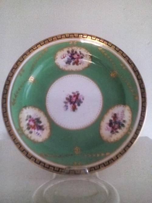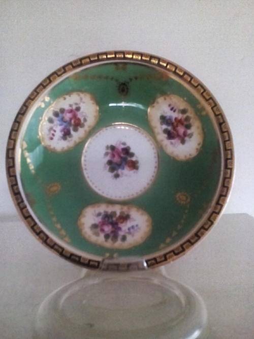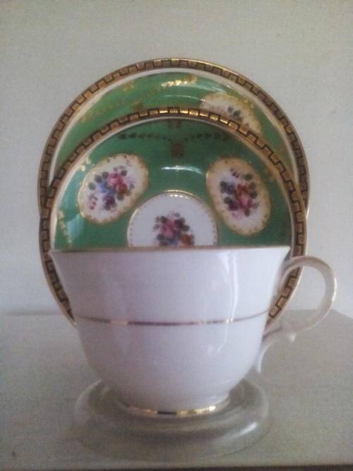 Fine porcelain tea trio by Heathcote china.Crenellated black and gold edge framing a crisp apple green border with three scalloped oval cartouches with hand coloured flower posies. Repeated singly to centre. Gilded swags between cartouches. Stamped to base Heathcote and initials for H.N.Williamson. Pattern name is Pembroke .Back stamp used from 1912 to 1928.Side plate measures 170mm across. Saucer measures 140mm across. Cup measures 90mm across and 60mm high. Normal age related wear and tear, but overall good condition.