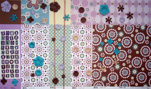 3BugsInARug Rhapsody Themed Set with 7 sheets of 12"x12" patterned Paper, 3 sheets of 12"x12" ColorMates cardstock (colours: Medium Lovely Liliac, Deep Coffee Brown & Light Totally Tan), Alphabet stickers, multi-coloured paper flowers plus brown & tan organza ribbon
