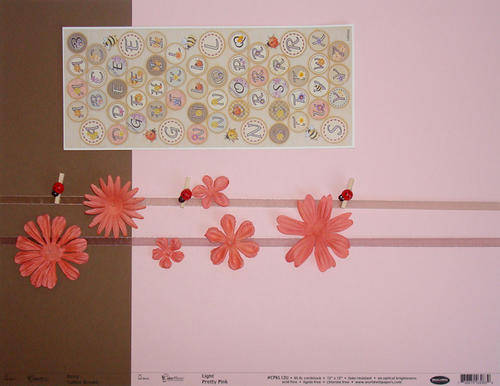 LadyBug Floral Themed Set with 12"x12" ColorMates cardstock (colours: Light Pretty Pink & Deep Coffee Brown), Alphabet stickers in matching hues, a sprinkling of peachy-pink paper flowers & ladybug mini-pegs, plus brown & tan organza ribbon