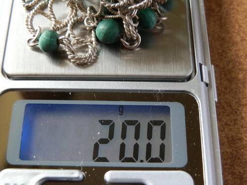 Vintage sterling silver malachite necklace, tests positive for sterling silver and in good condition. The length is 43 g, width 8 mm and the weight 20 g. The size of the stones is 6 mm diameter each.