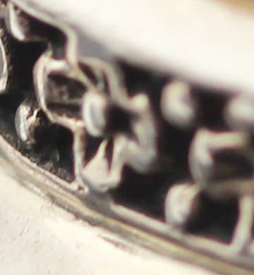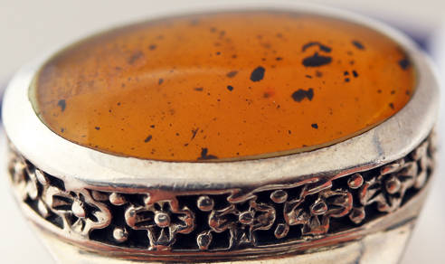 This gorgeous piece features a large oval cabochon, domed, rising 7mm above the finger from its bezel-setting in sterling silver. The frame of the bezel is decorated with an intricate floral design, textured and detailed, in comparison with the the smooth polished surface of the large cigar band shank. The Baltic amber's honeyed tones are made more intriguing by several natural brown inclusions. The ring bears the 925 hallmark indicating sterling silver and the jeweller's signature. One of the nicest features of the ring is its broad silver shank, particularly on the shoulder. It gives the ring a nice solid feel and with its decorative raised bridge under the ring head to hold the baltic amber, it has a nice quality feel to it. It is vintage - not sure of age - but there is a distinct abrasion across one section of the amber. The ring is quite a substantial piece of jewellery at 8,40 grams and 22m long x 15mm wide, it will appeal to someone who likes their rings big, bold and beautiful.