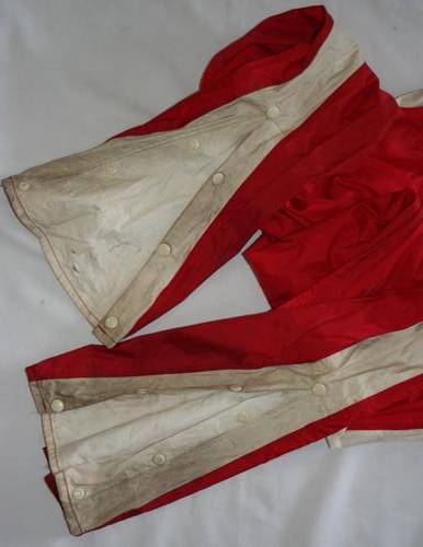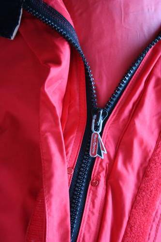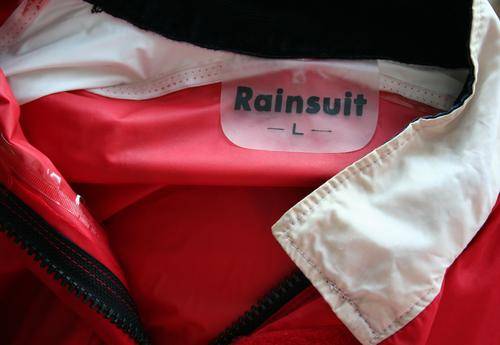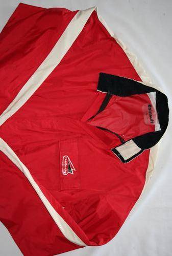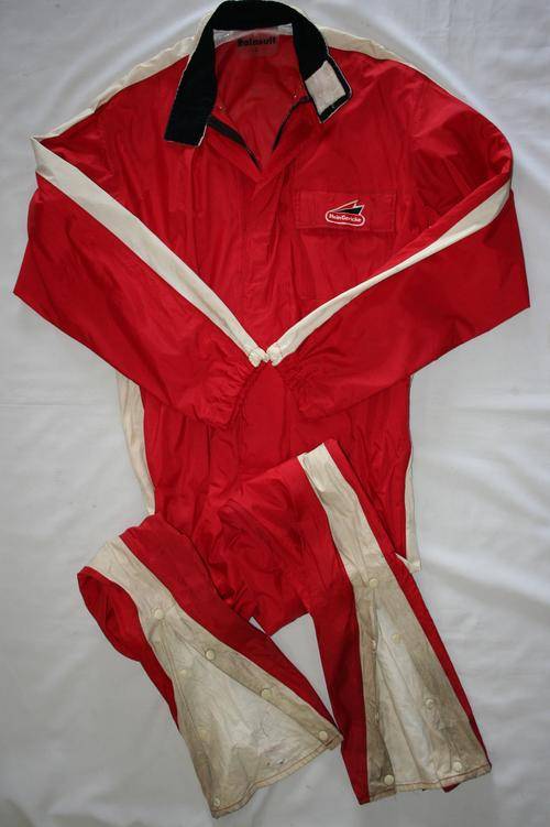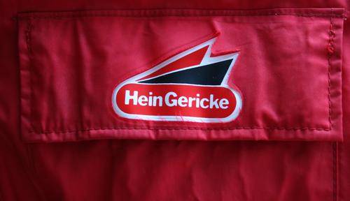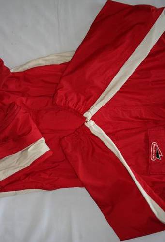 A Hein Gericke motorcycle rain suit. Label size: Large. Closes with a zipper and Velcro. Good condition -- no damage. Total length: 1,67m . Armpit to armpit in front: 61cm . Inside leg: 87cm . Between shoulders at the back: 54cm .