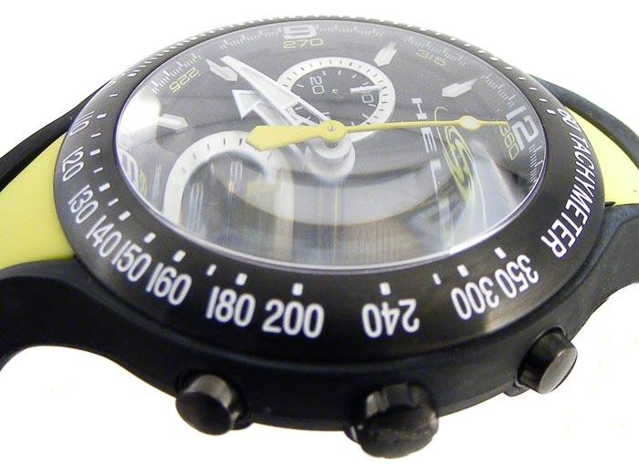 Tachymeter scale on a stationary bezel for determining the speed of a moving object over a measured distance.