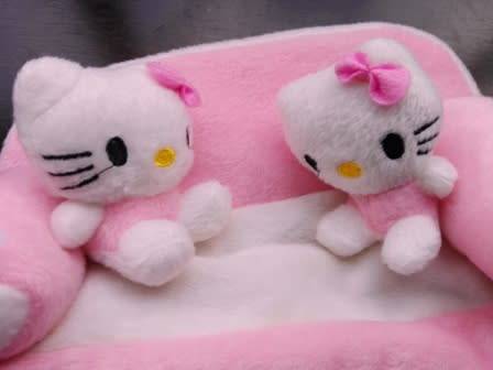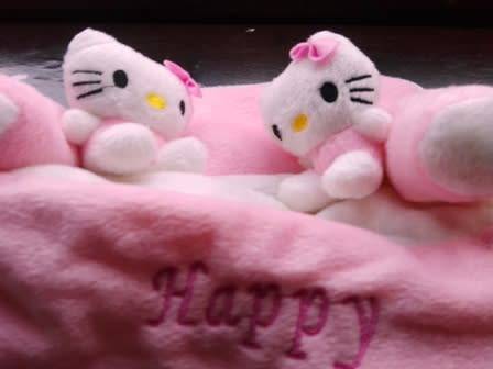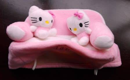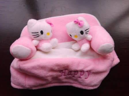 Hello Kitty tissue box cover in the shape of a couch with two built-in Hello Kitty's stuffed animals and "Happy" embroidered in pink on the front! This cover will turn any boring tissue box into something special for that special little girl. Size 25 x 18 x 12 cm. Fits most tissue boxes. Cover in excellent condition!