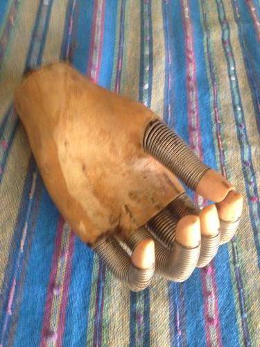 Very interesting !! Vintage! The mechanical hand can open and close by pulling a wire on the back. It used to be screwed on to a long stick and the whole thing was then covered in a suit-like sleeve and glove, and used to get boxes from the top shelf in shops.