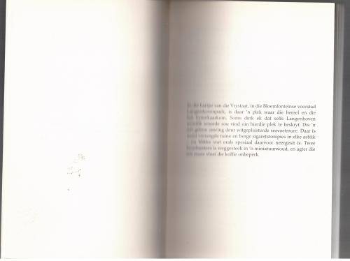 Finalis in Human & Rousseau se Ek is ‘n Skrywer-kompetisie. Die krag van hierdie debuut lê daarin dat dit die lewe uit die perspektief van die depressielyer vir jou nuut maak. In die hartjie van die Vrystaat is daar 'n huis met 'n wit muur daarom. Agter dié muur ontvou verhale waarvan bitter min mense ooit hoor. Dié huis is die kliniek vir depressielyers. 'n Jong pasiënt stap die kliniek binne. En saam met hom ervaar jy die onbekende en afgeslote wêreld. Op sy gemaak-weerbarstige manier ervaar die leser al die roetines, sien die personeel en ander pasiënte uit sy sardoniese perspektief en beleef sy grille, sy gemoedskwellings en vertwyfeling. Die aantal weke in die kliniek word 'n meesleurende verhaal – dit word die ontdekking van 'n wêreld. Ook 'n boek vir die ouer of jonger leser.