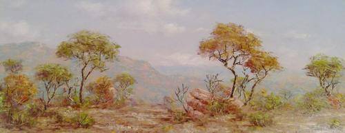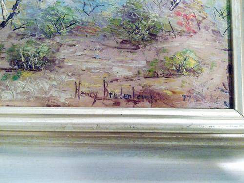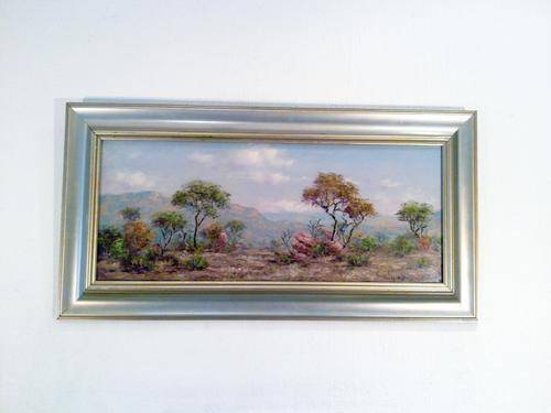 A beautiful landscape for renowned SA artist, Henry Bredenkamp. This stunner measures 60cm x 24 cm and the beautiful frame measures 73cm x 38cm. Offered at a very low price for an artist of this stature, do not loose out!