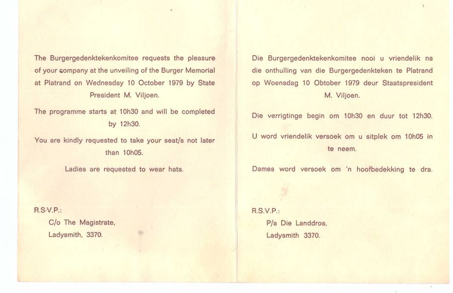 Herdenkingsprogram onthulling van die Burgergedenkteken Platrand Ladysmith 10 Okt. 1979