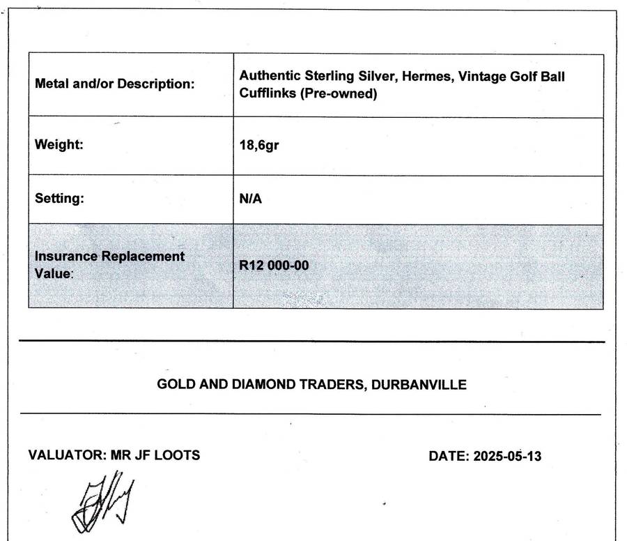 Hermes Sterling Silver Vintage Golf Ball Cufflinks valued at R12 000