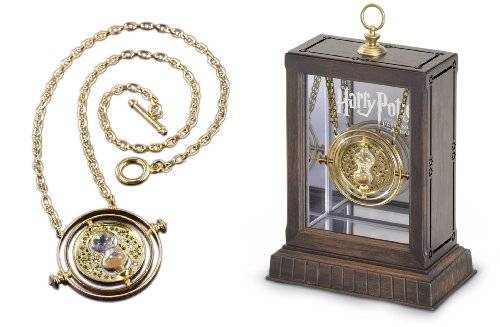 An authentic recreation of Hermione's TIME TURNER as featured in the movie Harry Potter and the Prisoner of AZKABAN . The TIME TURNER is centered with a working miniature hourglass and its inner rings rotate. Plated in 24 karat gold; measures 1 3/8 inches in diameter. Chain measures 18 inches. Comes complete with a display.